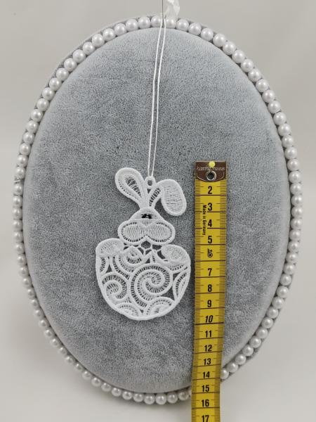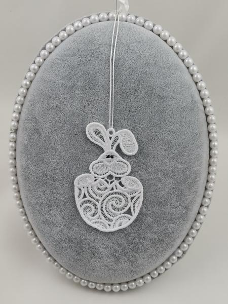Lace Produkte werden mit einer Stickmaschine und Stickgarn auf wasserlöslichem Vlies gestickt. Nach dem Stickvorgang wird das Vlies ausgewaschen, sodass letztendlich nur die Stickerei übrig bleibt.