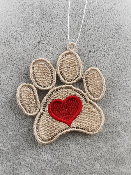 Lace Produkte werden mit einer Stickmaschine und Stickgarn auf wasserlöslichem Vlies gestickt. Nach dem Stickvorgang wird das Vlies ausgewaschen, sodass letztendlich nur die Stickerei übrig bleibt. Nach dem Trocknungsvorgang wird noch das Band zum aufhängen befestigt.