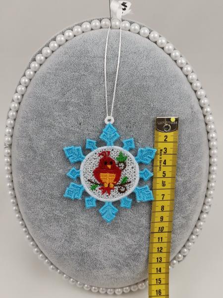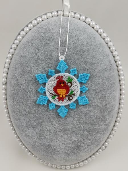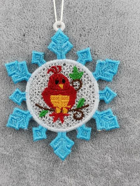 Lace Produkte werden mit einer Stickmaschine und Stickgarn auf wasserlöslichem Vlies gestickt. Nach dem Stickvorgang wird das Vlies ausgewaschen, sodass letztendlich nur die Stickerei übrig bleibt. Nach dem Trocknungsvorgang wird noch das Band zum aufhängen befestigt.