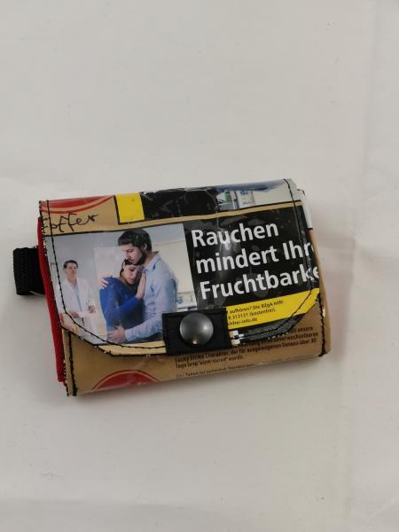 Diese kleine Geldbörse besteht aus einer alten Tabakverpackung. Zur Stabilisierung wurde diese mit Laminierfolie verstärkt.
