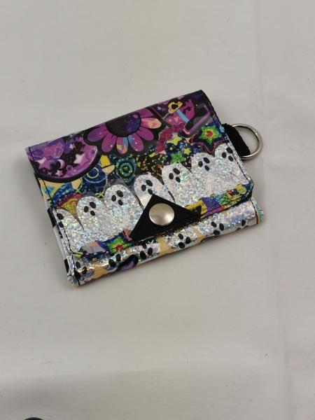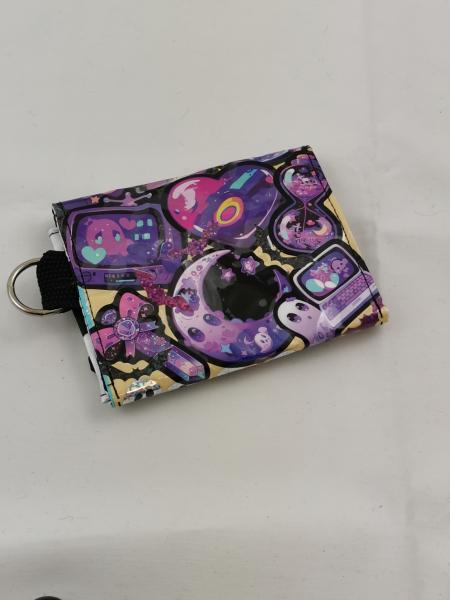 Diese kleine Geldbörse besteht aus einer alten Chipstüte und unzähligen Stickern. Zur Stabilisierung wurde diese mit Laminierfolie verstärkt.